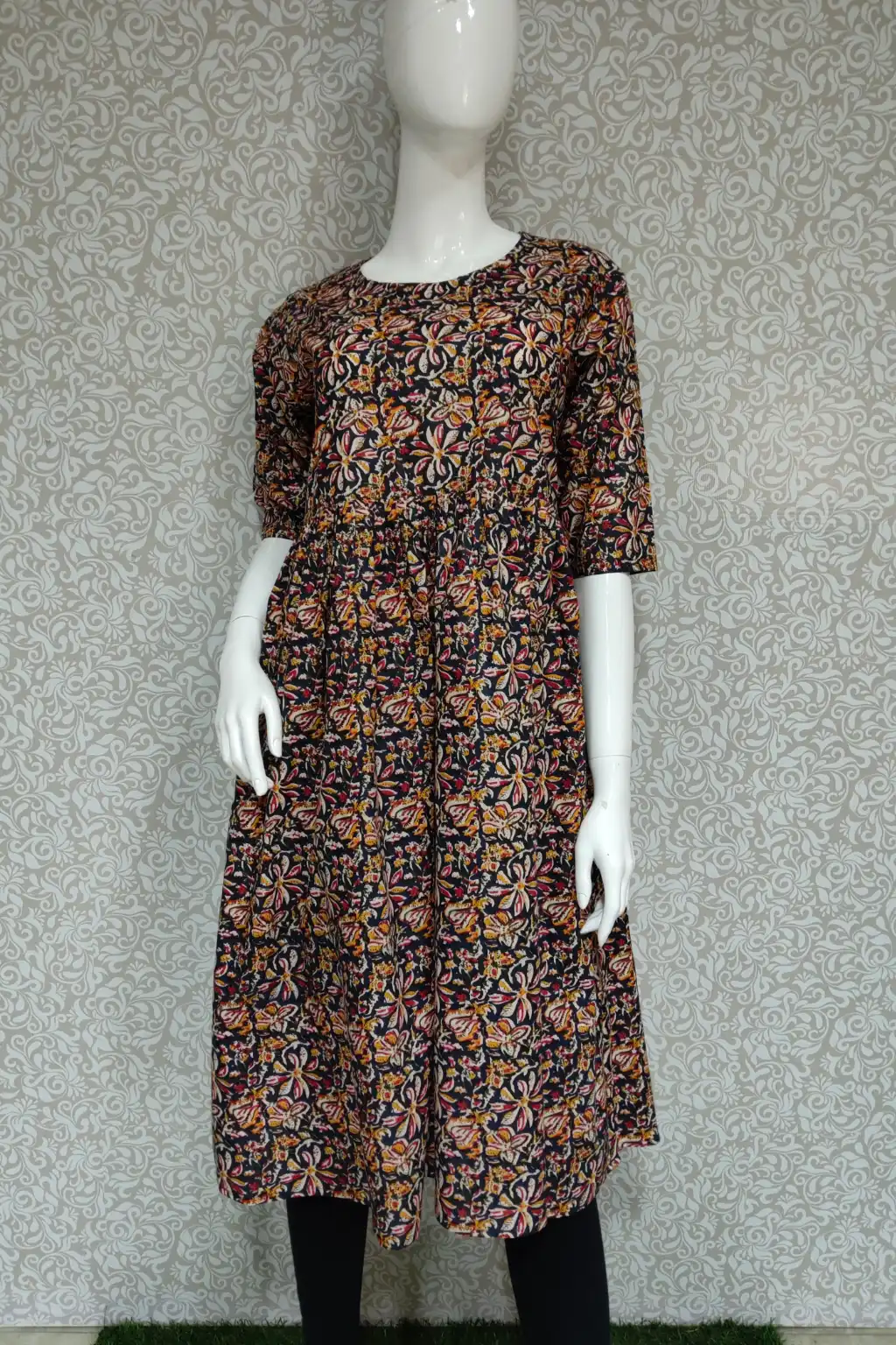 Elevate your everyday wardrobe with this black cotton kurti featuring an all-over vibrant multicolor floral print. Designed with an empire waistline and gentle gathers, this kurti offers a flattering A-line silhouette that suits all body types. The round neckline and elbow-length sleeves make it perfect for casual outings, office wear, or relaxed evenings. Made from soft, breathable cotton, it ensures all-day comfort with a stylish touch. Pair it with leggings or palazzos for a complete look.
