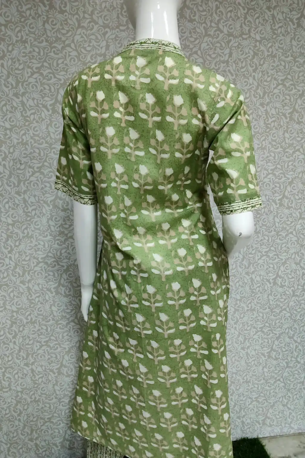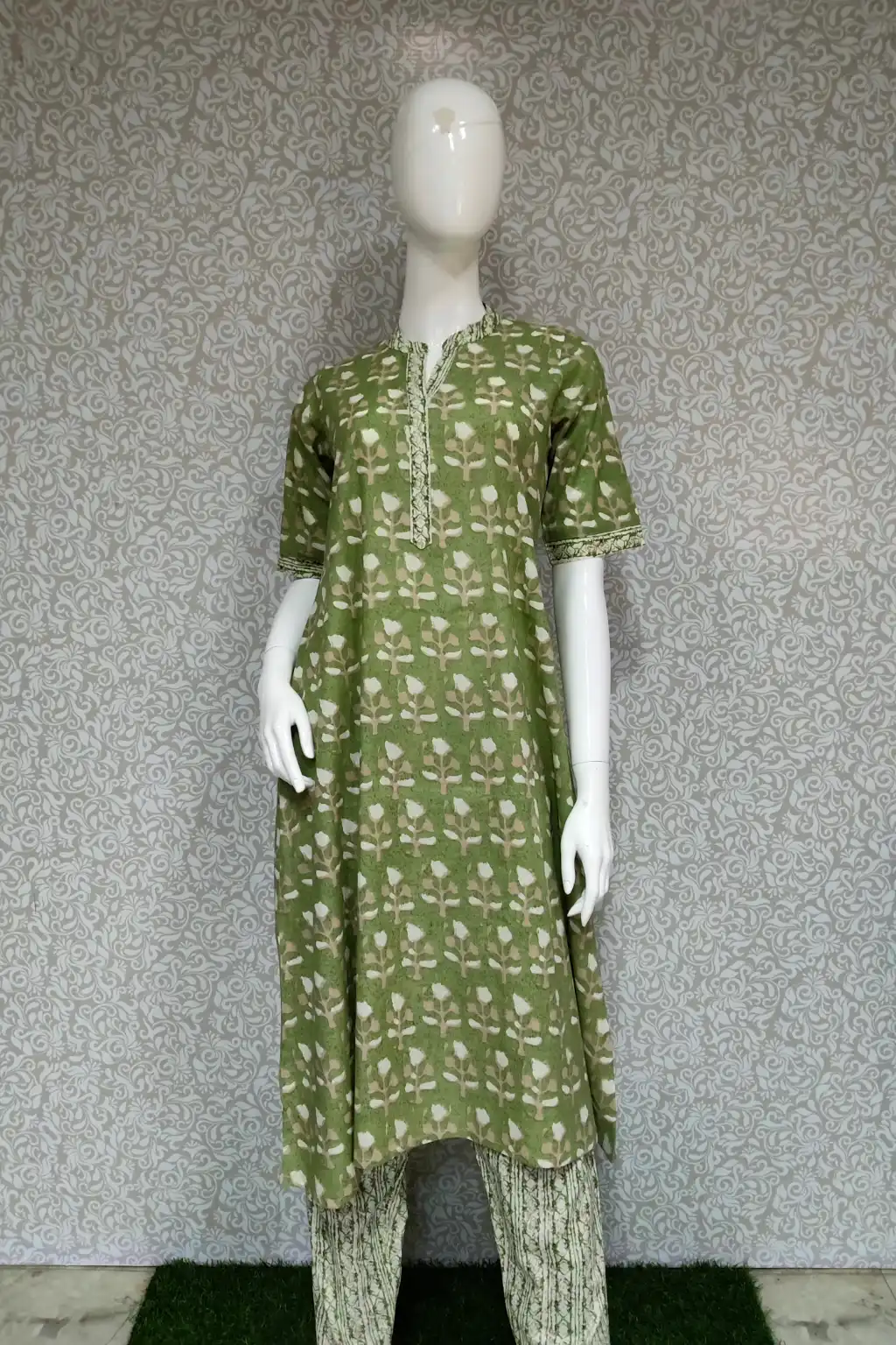 Soothing earthy green cotton kurta set with off-white floral block prints, lace detailing, and comfortable printed pants — ideal for everyday elegance and effortless style.