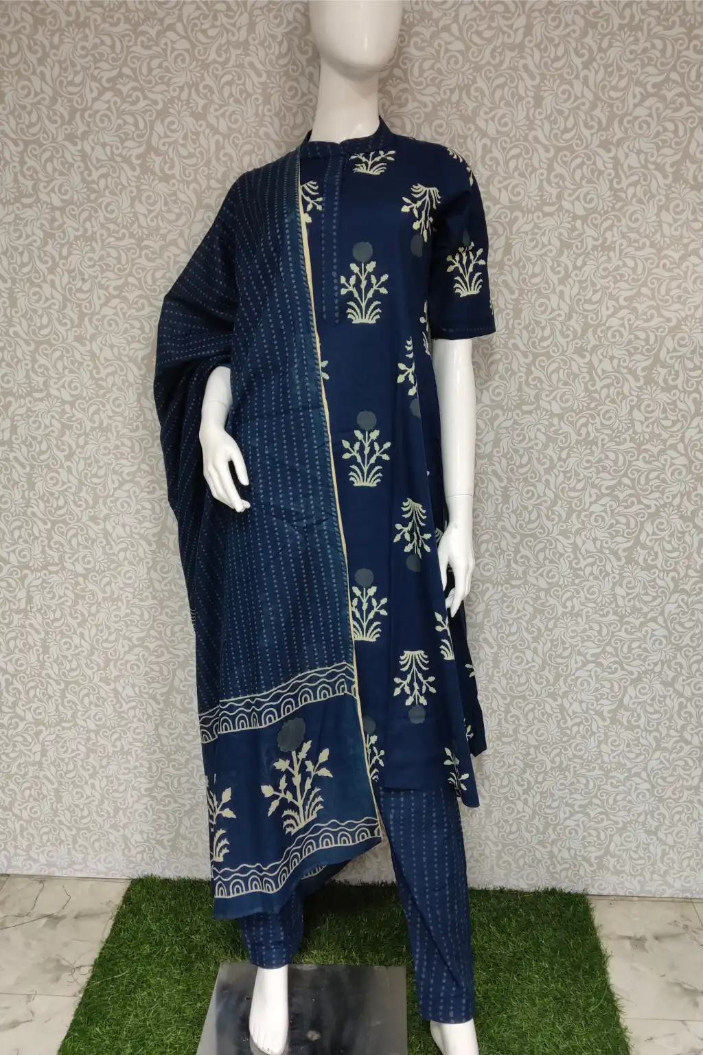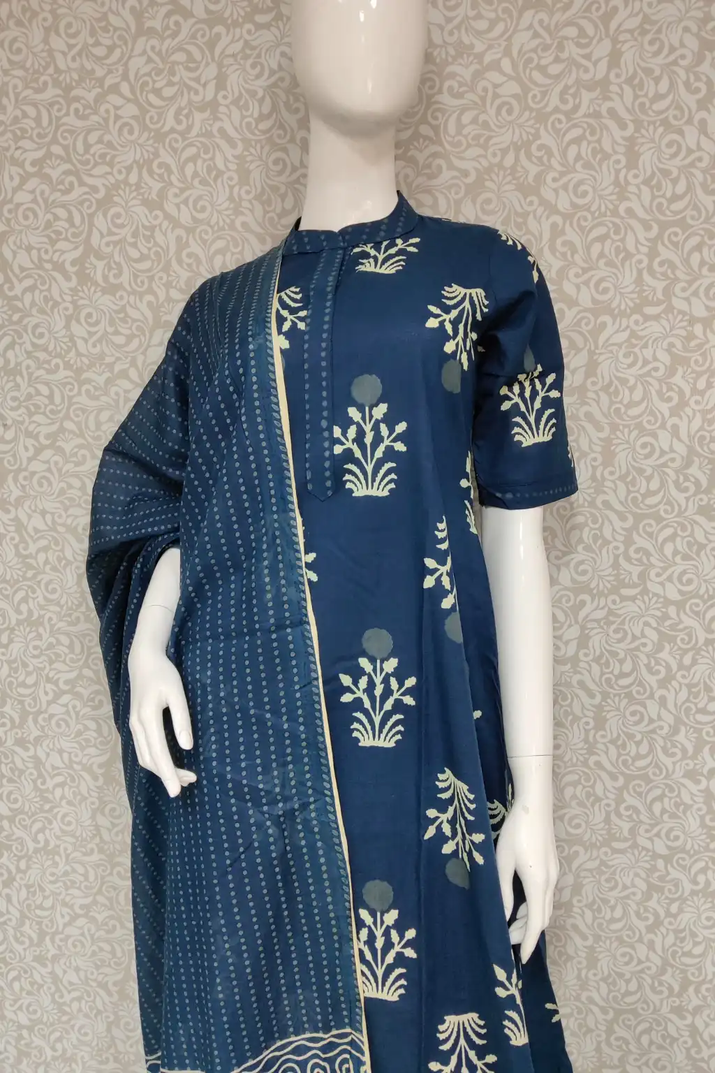 Brighten your ethnic collection with this stunning royal blue kurti set. Crafted in breathable cotton, it features delicately printed white floral patterns that exude charm. The kurta has a sleek mandarin collar and short sleeves, paired with matching pants and a printed dupatta. Ideal for both everyday wear and festive occasions, this set combines comfort and traditional elegance.