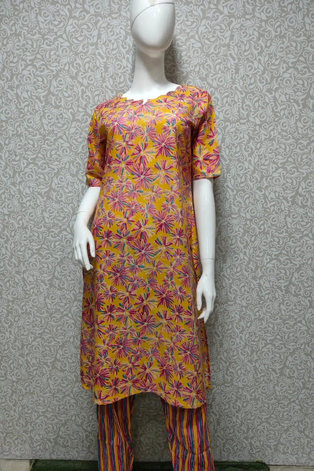 A cheerful yellow cotton kurti set featuring vibrant floral prints and multicolor striped pants — perfect for festive flair, daily wear, or casual comfort.
