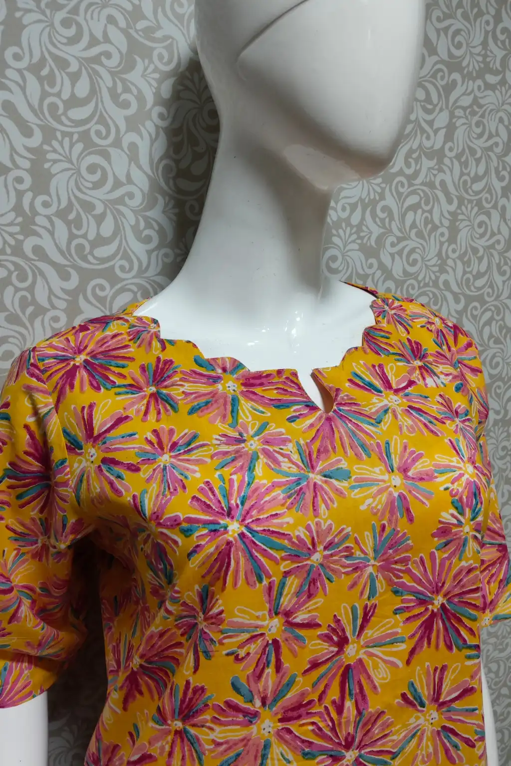 Brighten up your ethnic wear collection with this sunshine yellow cotton kurti featuring a lively all-over floral print in pink, green, and blue hues. Designed with elbow-length sleeves and a scalloped round neckline, this kurti offers both comfort and charm. The slightly curved hem adds a stylish touch. Paired with matching multicolor striped pants, this set brings vibrant coordination to your look. Crafted from breathable cotton, it is perfect for festive occasions, daily wear, or casual get-togethers.