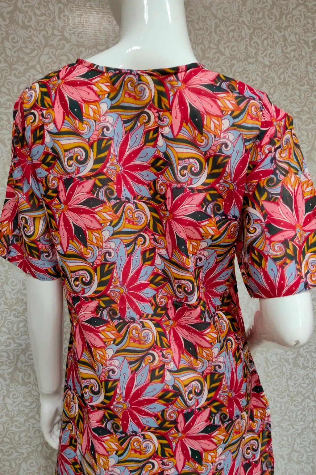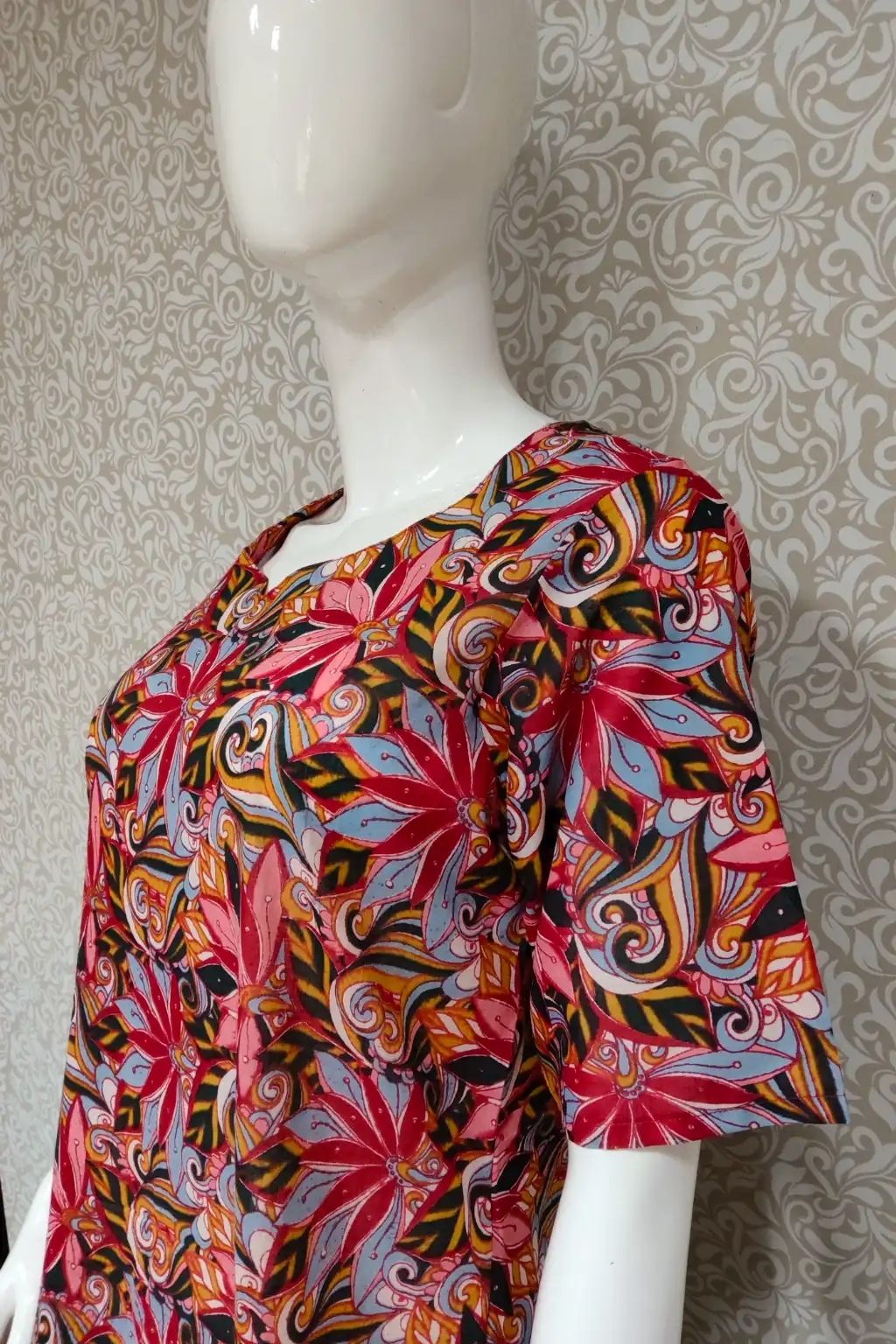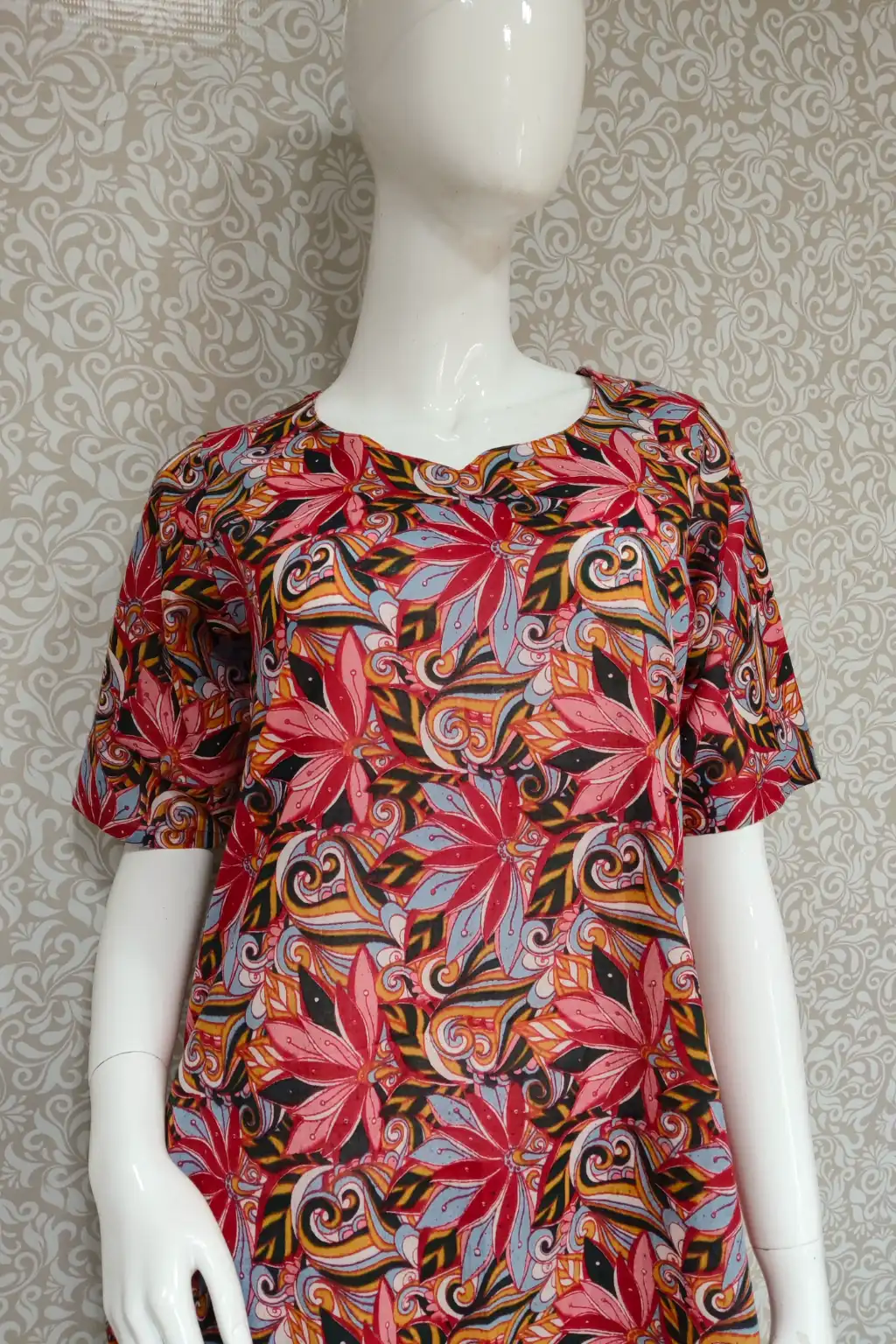 Make a bold statement with this vibrant cotton co-ord set featuring an eye-catching floral and paisley print in vivid shades of red, pink, orange, and blue. The kurti has a relaxed fit with short sleeves and a round neckline, perfectly balanced by matching straight-cut pants. Designed for all-day comfort, this ensemble is ideal for casual outings, home wear, or vacation styling. Its rich pattern and breathable fabric make it both striking and effortless.